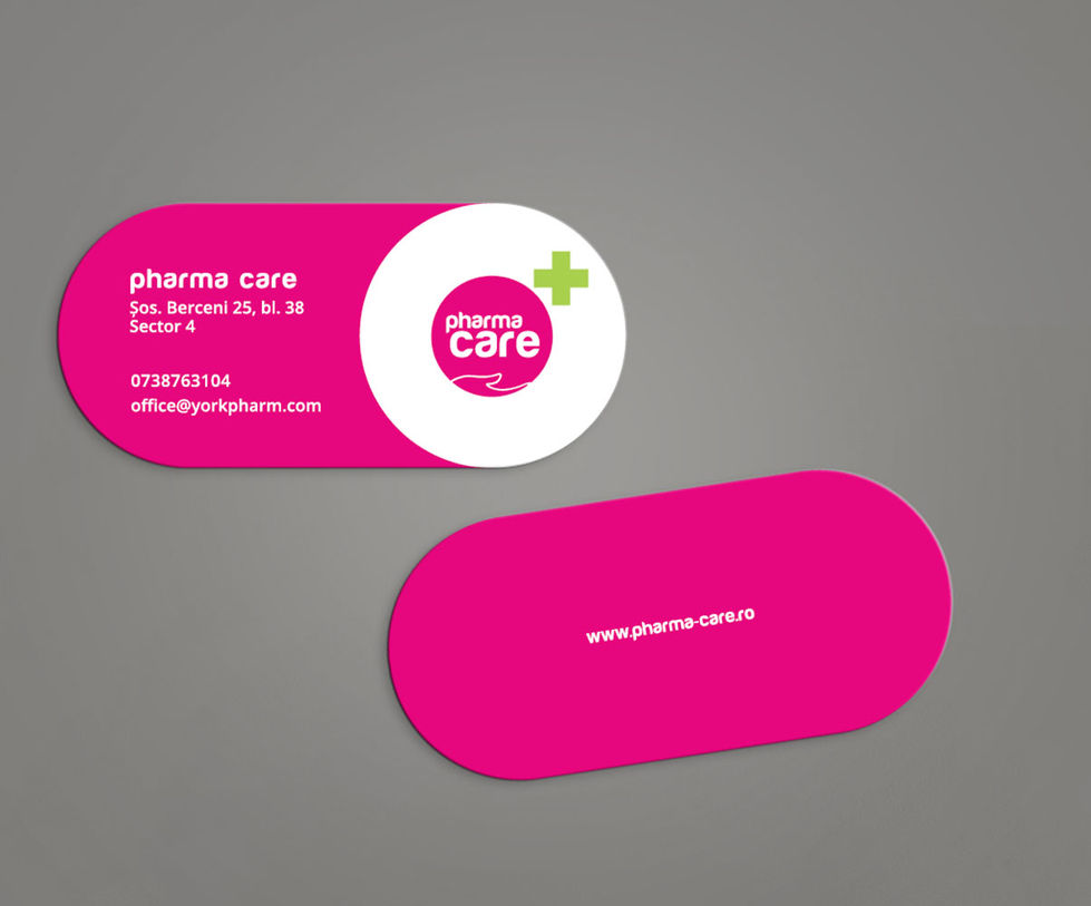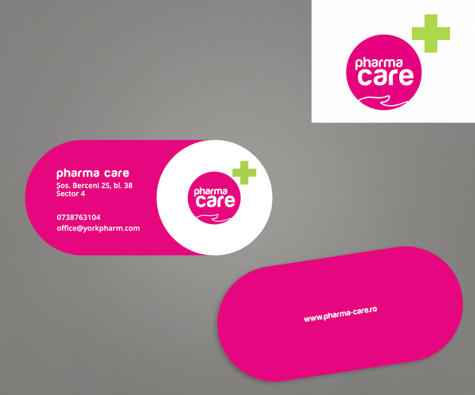 A showcase of branding and promotional materials, including exhibition booth with medical and scientific branding, Peroni-branded cups, and business cards for Pharma Care.